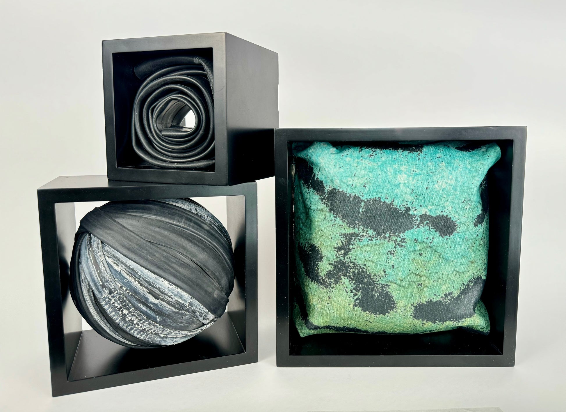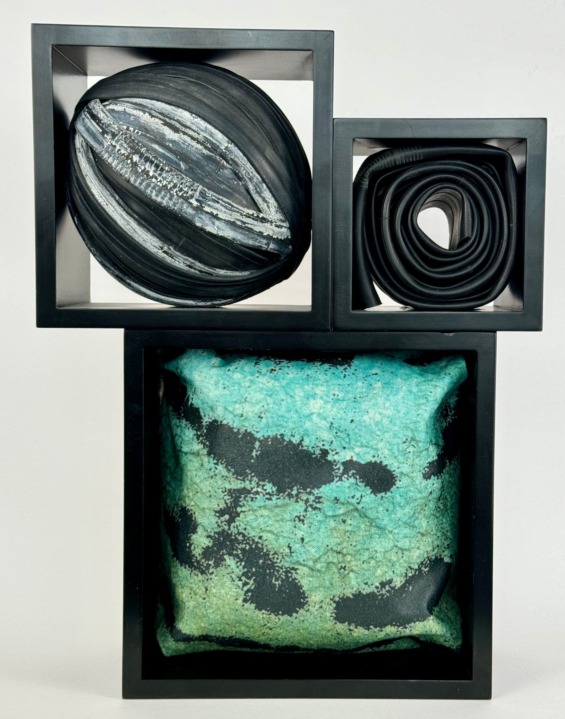 Thrift store frames with acrylic on bicycle tubes and laser printed raw canvas. Interactive, 2024