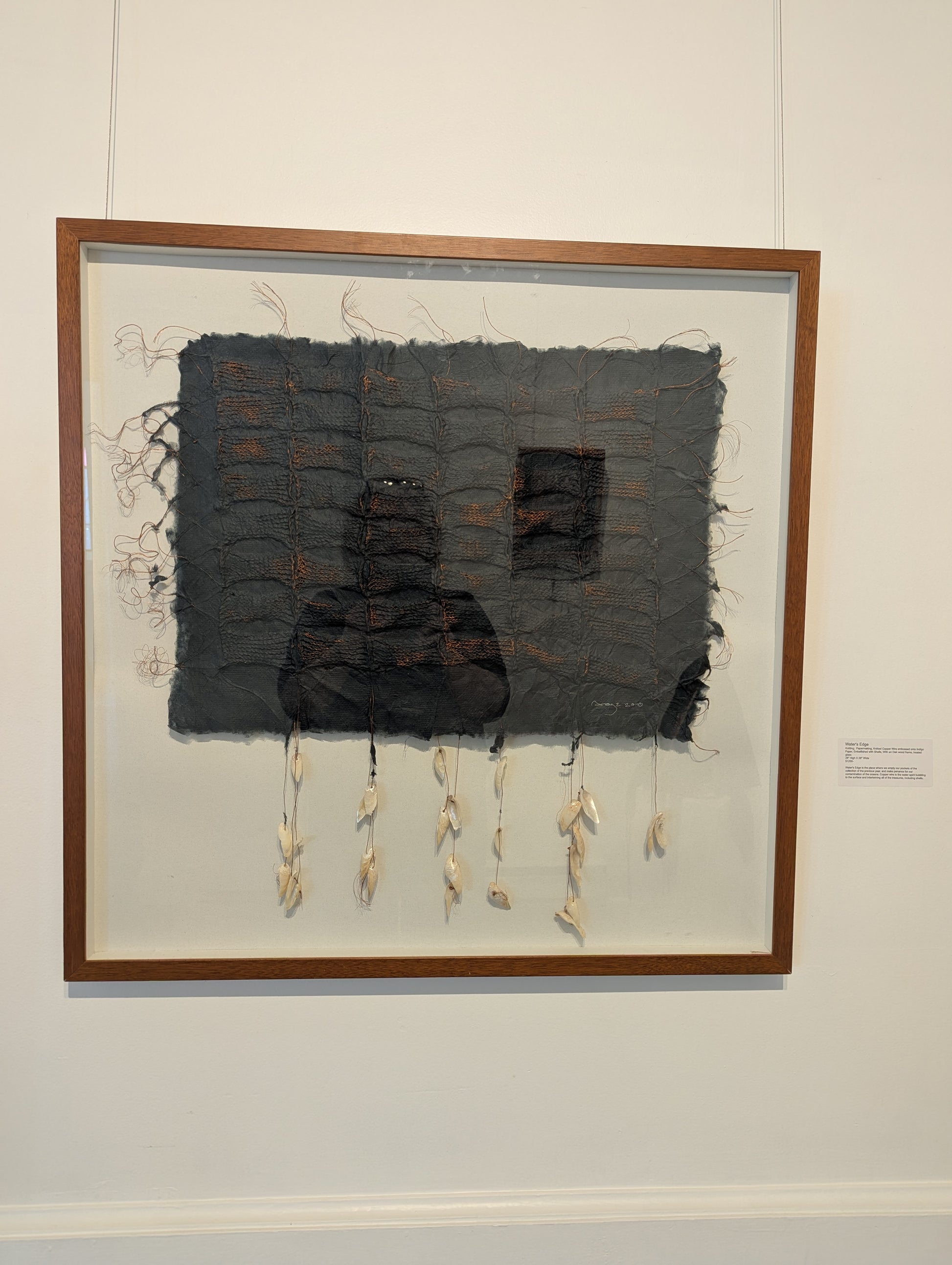 Knitting, Papermaking Knitted Copper Wire embossed onto Indigo Paper Embellished with Shells, With an Oak wood frame, treated glass